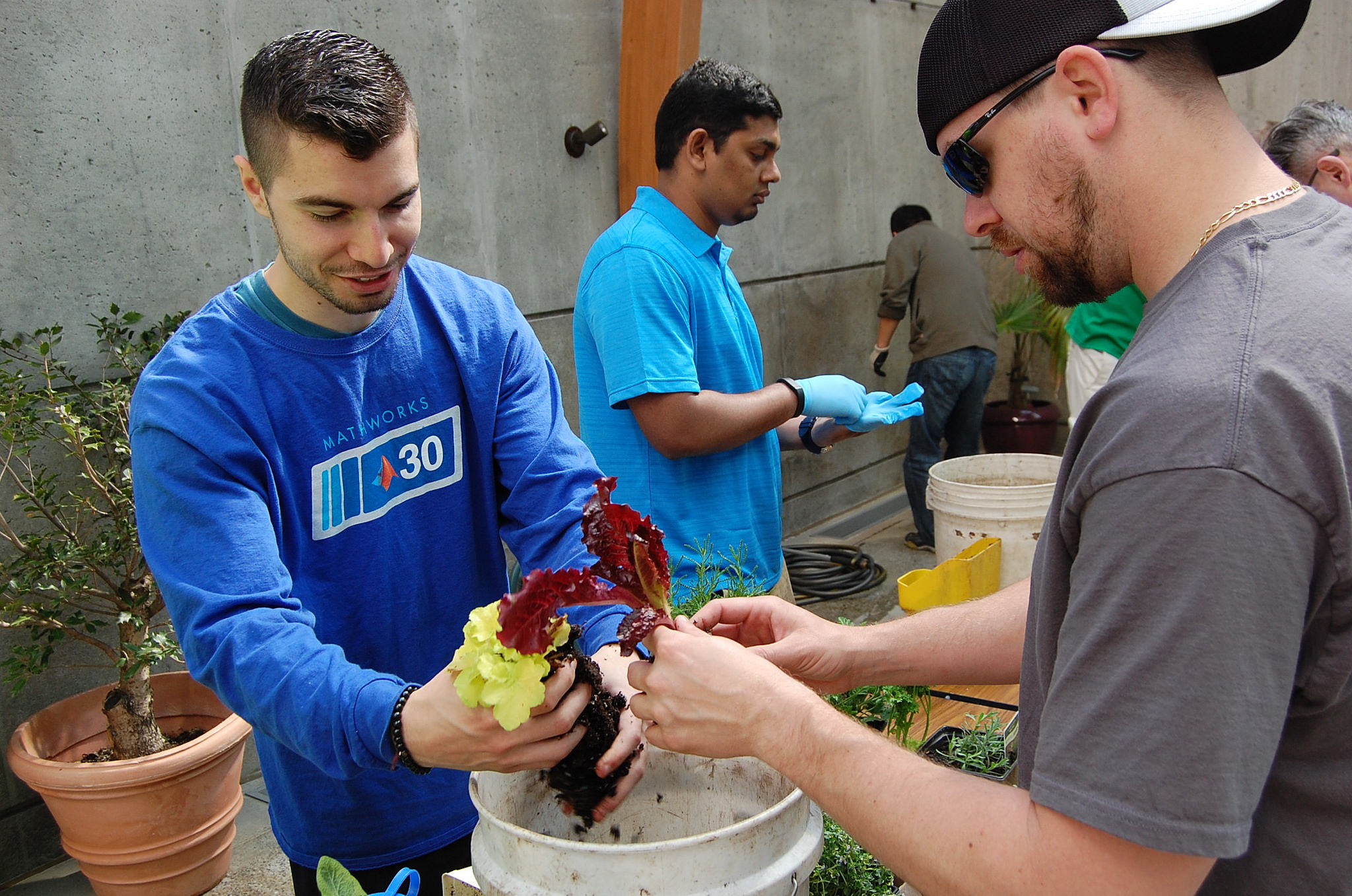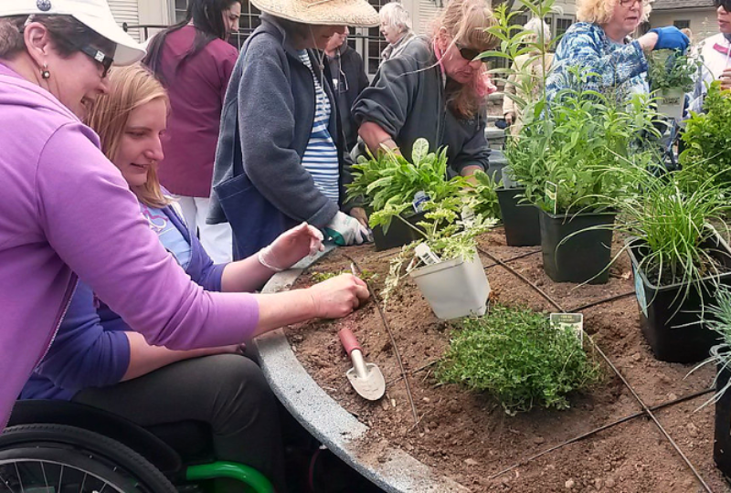 Volunteers from Canines for Disabled Kids help plant the herb garden bed.