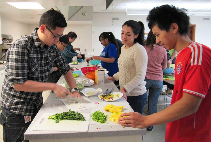 The Youth Group prepares a meal at New England Botanic Garden at Tower Hill with volunteers from UMass Medical School. (Photo by WRAP)