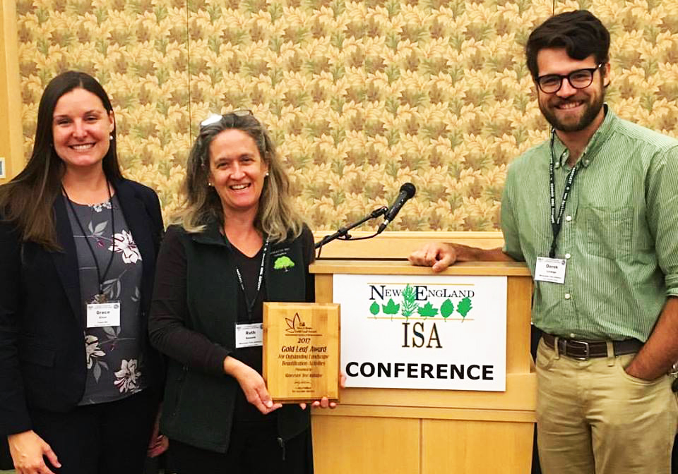 The award was presented on Oct. 2, 2017, at the Southbridge Hotel & Conference Center to WTI Executive Director Ruth Seward, Community Forester Derek Lirange, and New England Botanic Garden at Tower Hill CEO Grace Elton.