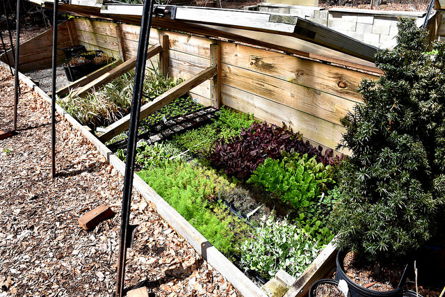 The next step is to bring the the plants to our cold frames. These structures are dug into the ground to provide nighttime warmth and each have covers we shut in the evening. But during the day the cold frames are open so the plants can harden off, which is a process of getting the plants used to living outside in the sun, wind, and rain. By slowly making the transition, plants avoid the shock of jumping from a climate controlled green house to the extremes of New England weather.