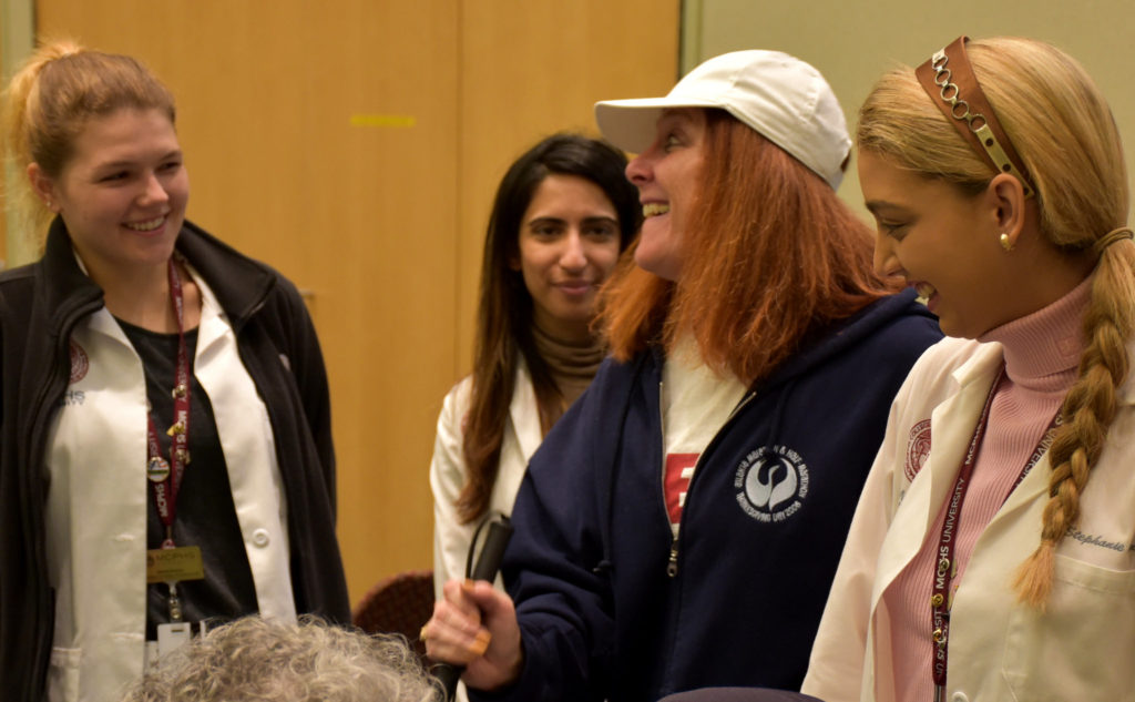 Liz Myska, a Worcester County Horticultural Society trustee, chats with MCPHS students on White Cane Safety Day.