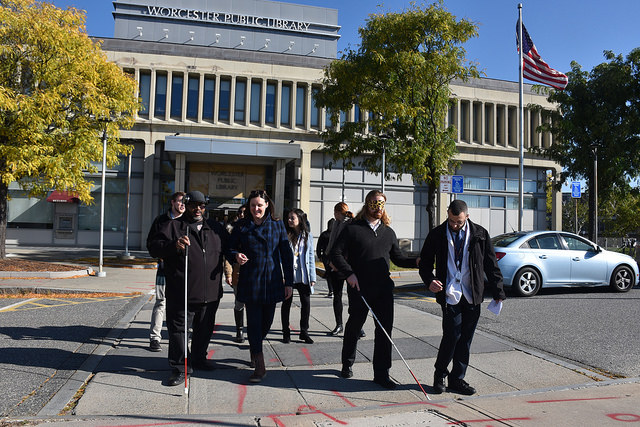 New England Botanic Garden at Tower Hill CEO Grace Elton had the opportunity to learn more about what it means to be a sighted guided, while others, like the Worcester Business Journal’s Brad Kane donned a mask to learn about the challenges of city navigation while blind. Students from the Massachusetts College of Pharmacy and Health Services Worcester observed and interacted with the participants.