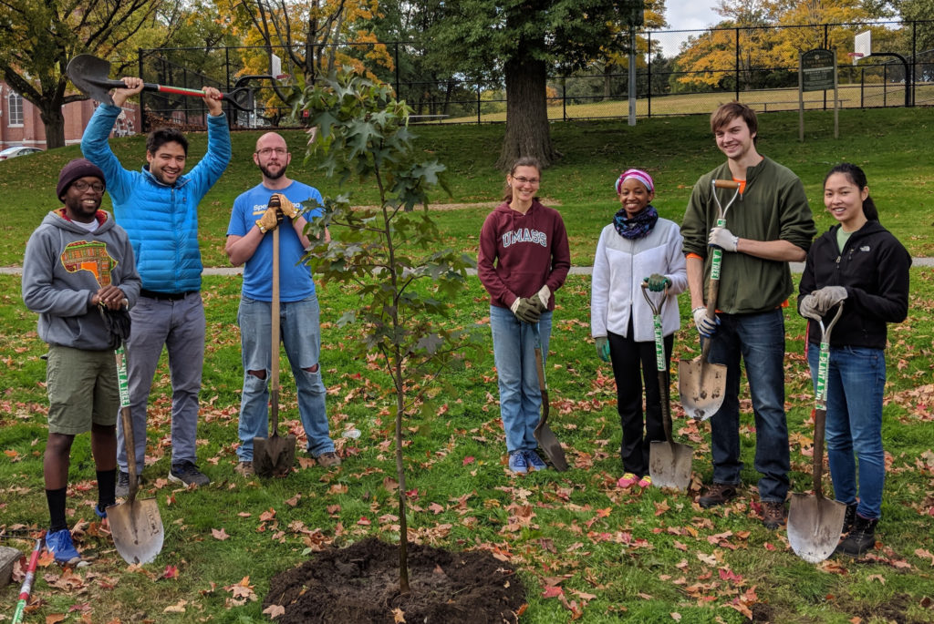 Volunteers from Clark University and WTI volunteer tree stewards plant trees in University Park in Worcester.