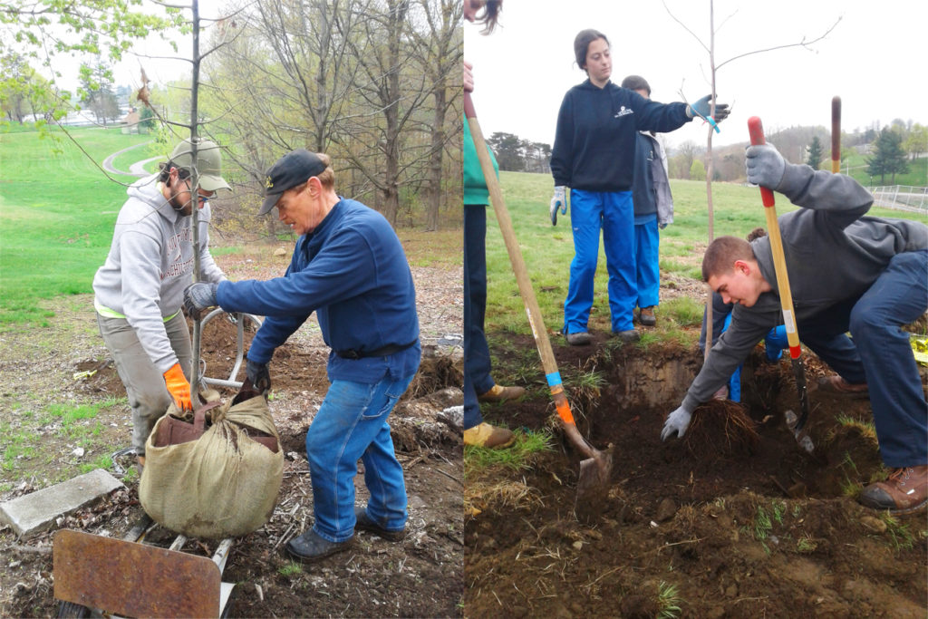 Over the course of the past 91 years many of the original trees died leaving large gaps in the memorial and an effort began in 2016 to replant the grove and create a new memorial as a gate to the grove began with the Green Hill Park Coalition. In the years since New England Botanic Garden at Tower Hill’s Worcester Tree Initiative became partners in the replanting effort to restore this important memorial. Over the course of three years we have been planting trees to fill the spaces left by the trees which died, and on Friday, May 3, we took to the hill once more to finish the job.