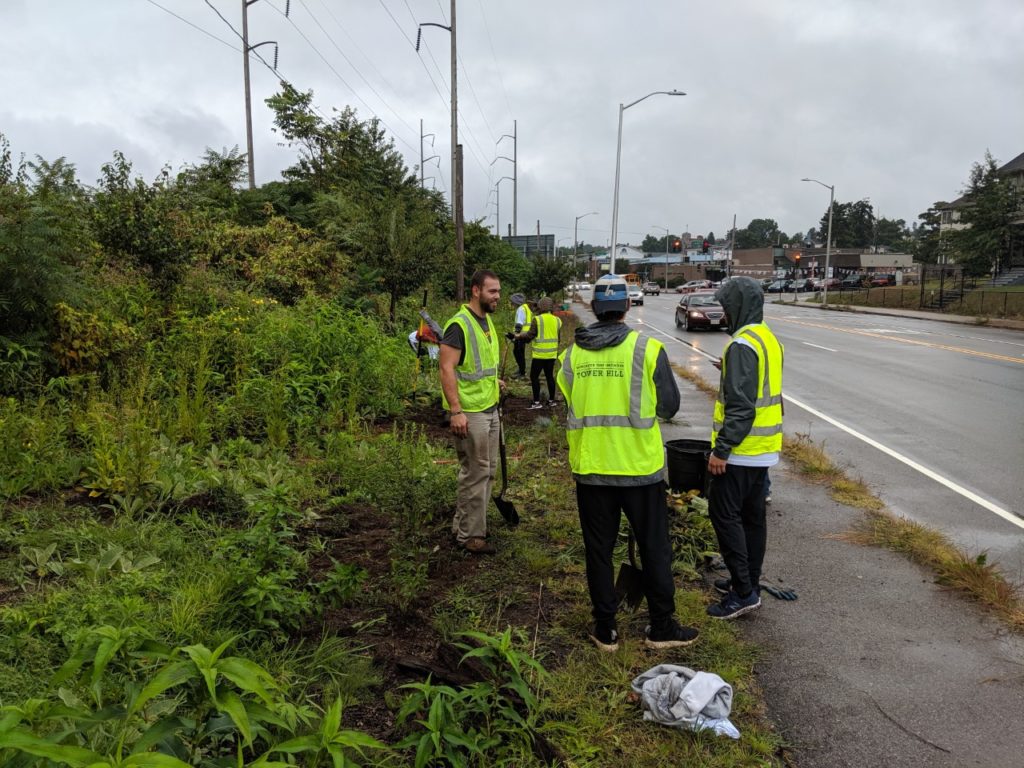 The project for the day was making improvements at our large scale landscape project on West Boylston Street. We’ve been fortunate to receive a lot of help on this site this year. Earlier in the summer The United Way of Central Massachusetts’ Youth Summer Volunteer Program, WooServes, came out twice to help at this site. We also received help from the Bruce Wells Scholars Upward Bound Program. These young men and women got to learn from three departments at New England Botanic Garden at Tower Hill during a week of shadowing. One day they worked with the education department, learning about the educational programs offered at New England Botanic Garden at Tower Hill, from adult and youth classes and trips to the exhibits. They spent a long, hot day in the field learning about urban forestry and landscape maintenance with the WTI program. And then they spent two days working with the Horticulture Department helping to care for the many different kinds of gardens at New England Botanic Garden at Tower Hill. Most recently we received help from WPI students during Work on Worcester, which we told you about last week.