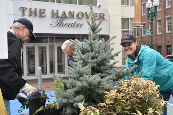 Hanover Theater, Worcester: Creating container garden space, THBG Horticulture Team and WTI team designed and planted lovely winter natives to enhance the Hanover Plaza. Maintained by Hanover volunteers, it adds a colorful inviting entrance to the theater space.