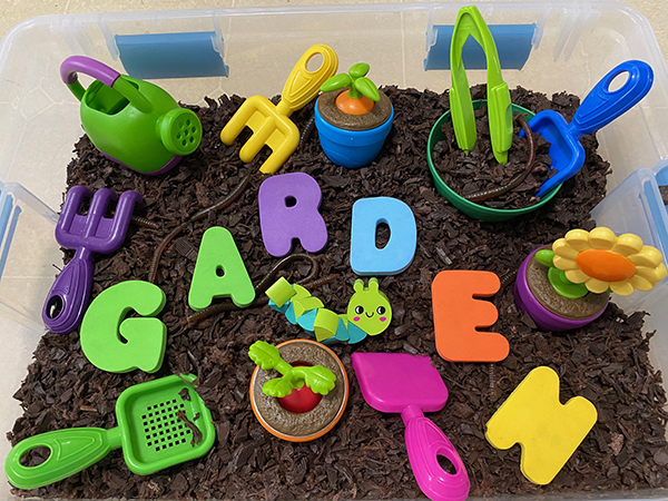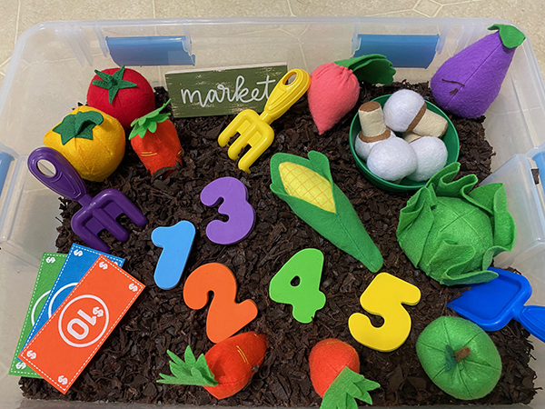 Sensory bins encourage open-ended play and provide endless opportunities for experimenting and learning. Sensory bin play engages multiple senses, stimulates critical thinking, promotes problem solving, and fosters creativity and imagination. Children may become scientists as they explore the ocean depths, bakers as they concoct mud pie recipes, or gardeners as they plant and harvest flowers, fruits, and vegetables. The addition of tools such as tweezers, tongs, droppers, and measuring cups can help strengthen fine motor skills and colorful letters and numbers can help with color recognition, counting, and word formation. No matter the theme or items you choose, get ready for hours of educational play.