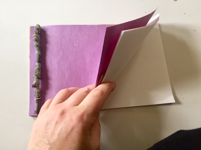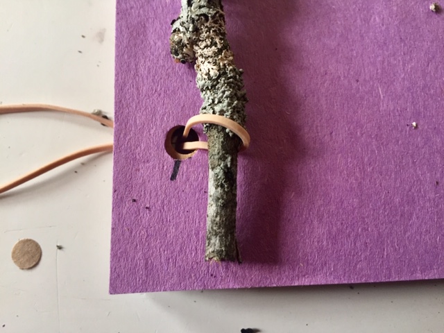Grab your twig and loop each rubber band around each end. Secure both bands to your twig and your nature journal by looping or tying off the ends. Your twig should act as the spine of your journal.