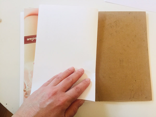 Top with a second piece of folded copy paper, and a piece of cereal box cardboard. The thinner cardboard will help to absorb any excess moisture from the plant material as it dries.