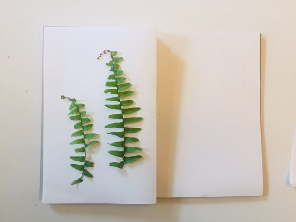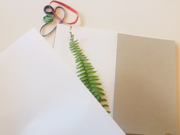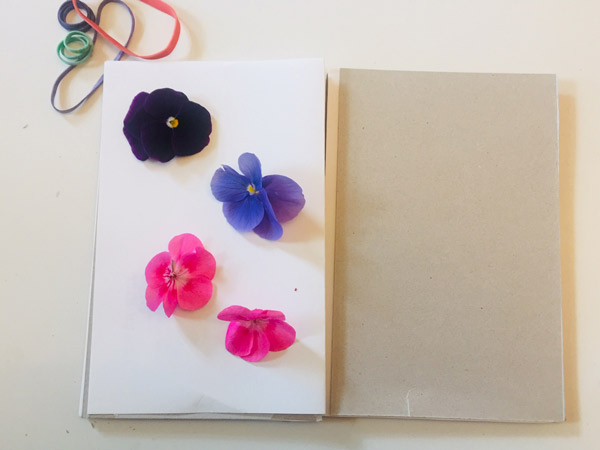 Select the fresh flowers or leaves you want to press and start by layering the bottom piece of corrugated cardboard, a folded piece of copy paper and your plant material.