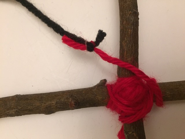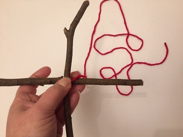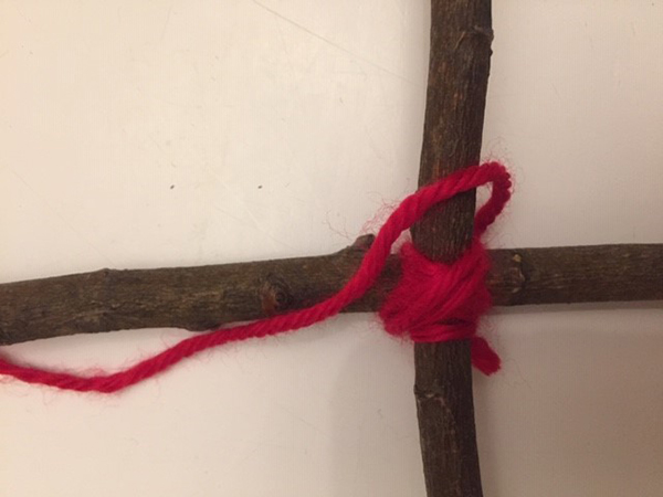 Next, wrap your yarn around the middle of your sticks where they cross over each other. Wrap diagonally, five times in each direction.