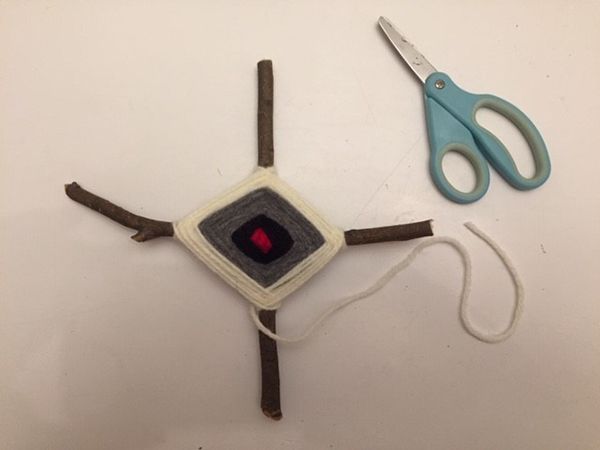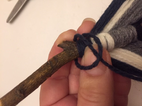 Finish by tying off your piece of yarn. Tie a knot around one stick to secure in place and trim your knot.