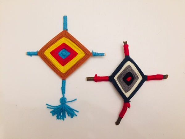 Gather your supplies and begin by choosing your yarn colors and arranging your sticks to form an ‘x’ shape.