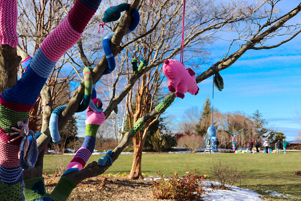 The Yarnstorm exhibit at New England Botanic Garden at Tower Hill is on display from January 16th to March 31st, 2021. During Yarnstorm, New England Botanic Garden at Tower Hill’s trees, benches, statues, and more will be decorated with bright, fantastical fiber artwork. The exhibit features over 25 unique pieces of art created with the help of over 40 local artists and includes over 2,500 colorful pom poms. Each artist found inspiration at the garden and used nature and imagination to create their one-of-a-kind pieces that spread messages of hope, peace, and wonder.