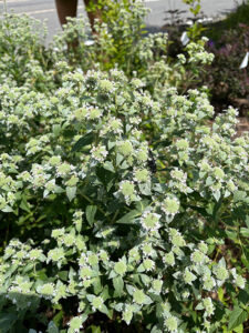 Bumblebee (Bombus spp.) approaching calamint (Clinopodium nepeta subsp. spruneri ‘White Cloud’) planted in one of the Pleasant Street Planters for People; Photo by Hunter Blanchard