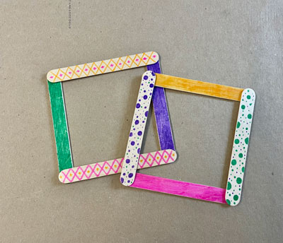 Create a frame for your suncatcher out of popsicle sticks. Either color your wooden popsicles or use colored ones. Hot glue the corners of four popsicle sticks to create a square, repeat this to make 2 frames. You will need two frames to place your suncatcher in between.