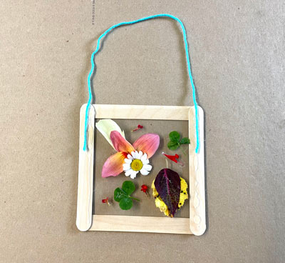 Find a sunny window to hang your creation. Look closely at your leaves and flowers to observe the veins and how the colors change in the sunlight. Enjoy your beautiful nature suncatcher and make one for every season!