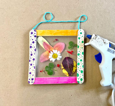 Before peeling off the backing of the contact paper on your second frame, cut a piece of string or ribbon and hot glue the string onto one of the frames. Peel off the contact paper backing on your second frame. Add hot glue to the exposed part of the popsicle stick to make sure the frames stick together. Gently place the additional frame over your plants to seal them in place. Hold the frames together tightly until the hot glue has dried.