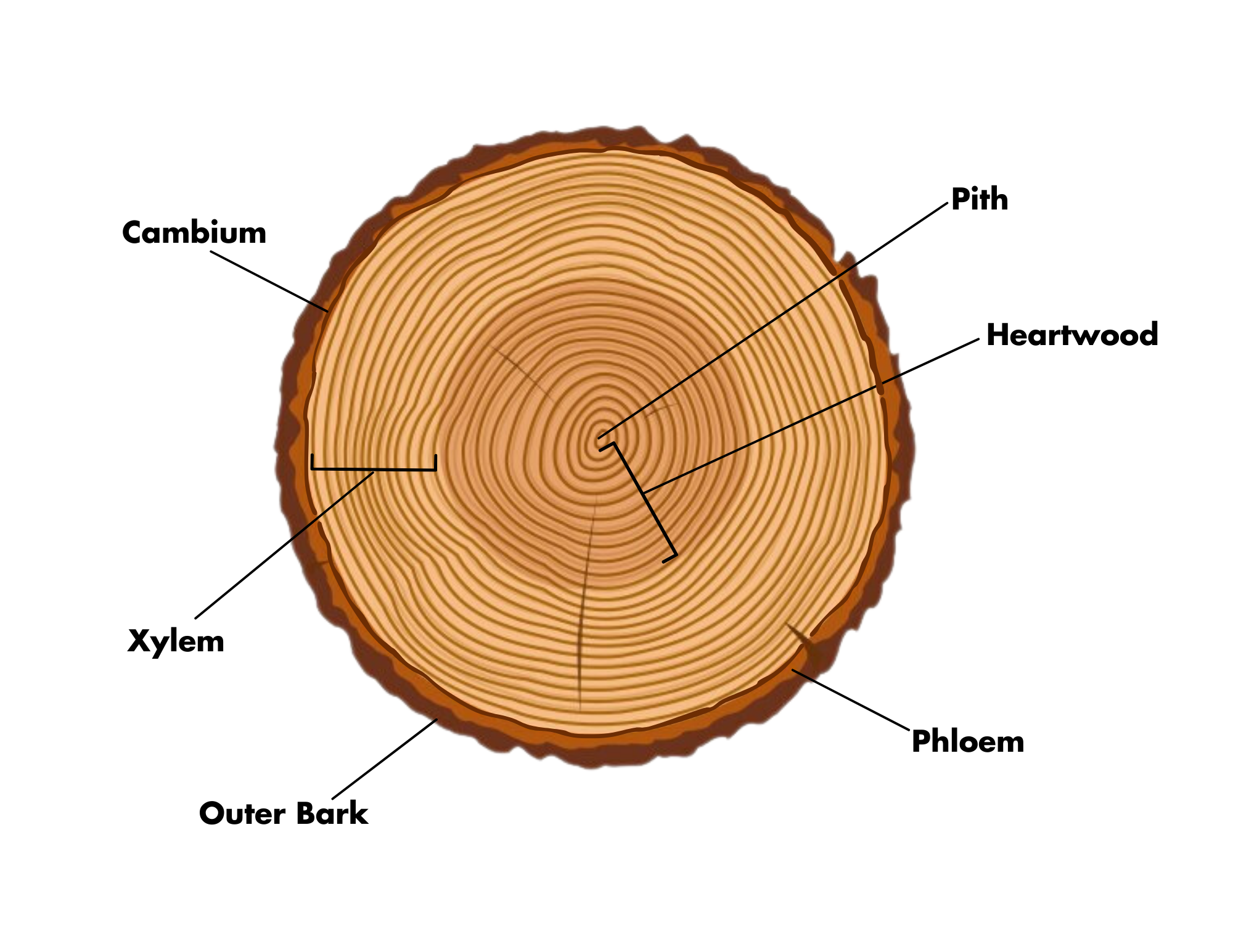 Level up! As you can see on the tree cookie diagram below, the trunk consists of six main parts. All plants have a phloem and xylem within their stem to move water and sugar up and down the plant. The xylem moves water from the roots to the leaves, and phloem moves sugar from the leaves to the roots to be stored. The core of the trunk is called the pith. It is the oldest part of the trunk and stores lots of nutrients for the tree. Heartwood is the hard, dead tissue surrounding the pith. Its role is to provide structural support. The lighter wood after heartwood is called sapwood; this is where the xylem is located. Next is the layer on the outside rim of the xylem called the cambium. The cambium is a layer of tissue that creates the xylem and phloem. It is located right in between them and adds new growth to each of these layers over time. The last two layers are the phloem and then the outer bark which protects the trees from the environment.