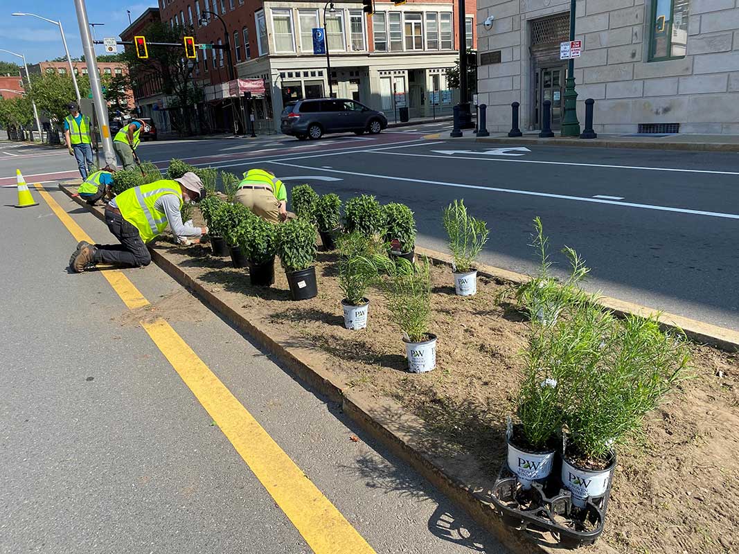 Along some city streets, it’s not feasible to plant trees in the ground because there aren’t designated tree wells or other medians available for planting. The Garden’s program Planters for People addresses this problem by placing large scale planters directly on sidewalks and filling them with trees, shrubs, and flowering plants. The program was first piloted in 2021 with six planters in Worcester’s Main South neighborhood. In 2022, with the help of Main South CDC and the Regional Environmental Council, the program expanded to include the six original planters as well as 12 more that had been going unused in the neighborhood. In 2023, the program continues to grow, with 12 more new planters headed to Main South. Three planters are also being installed along Pleasant Street in collaboration with the Pleasant Street Community Neighborhood Network, bringing the total for 2023 to 33.